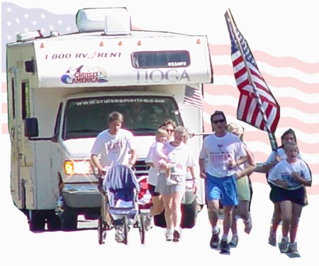 This is the RV that accompanies the runners. Normally, it is the first vehicle immediately behind the runners. Although it is equipped with a small kitchen, it does not have any AC electrical source, so the microwave and other cooking is out of the question. It does have a small toilet, but it should be used for emergencies only since the holding tank is small and the process of dumping the tank requires the RV leave the procession. This vehicle serves as the moving coordination center for the state coordinators and access is restricted. Runners are not normally boarded in this vehicle except in sparsely populated areas. Other support vehicles arranged by the states are normally used to transport runners.