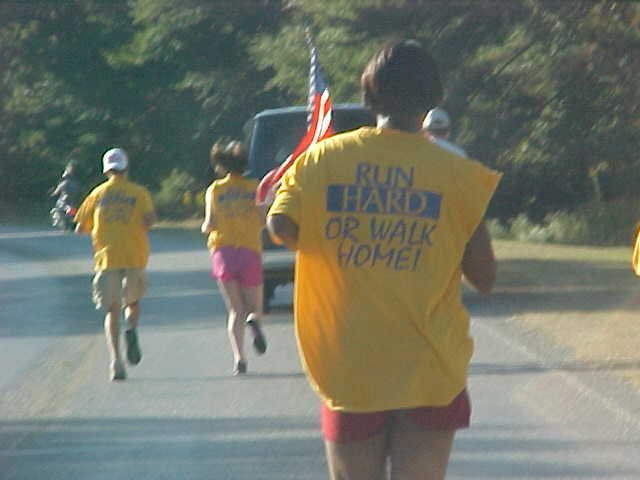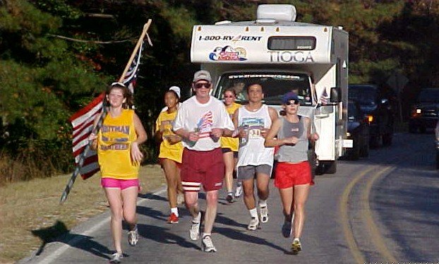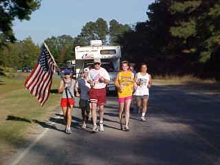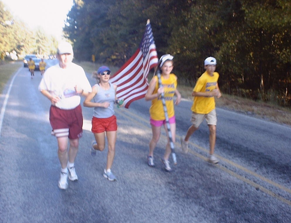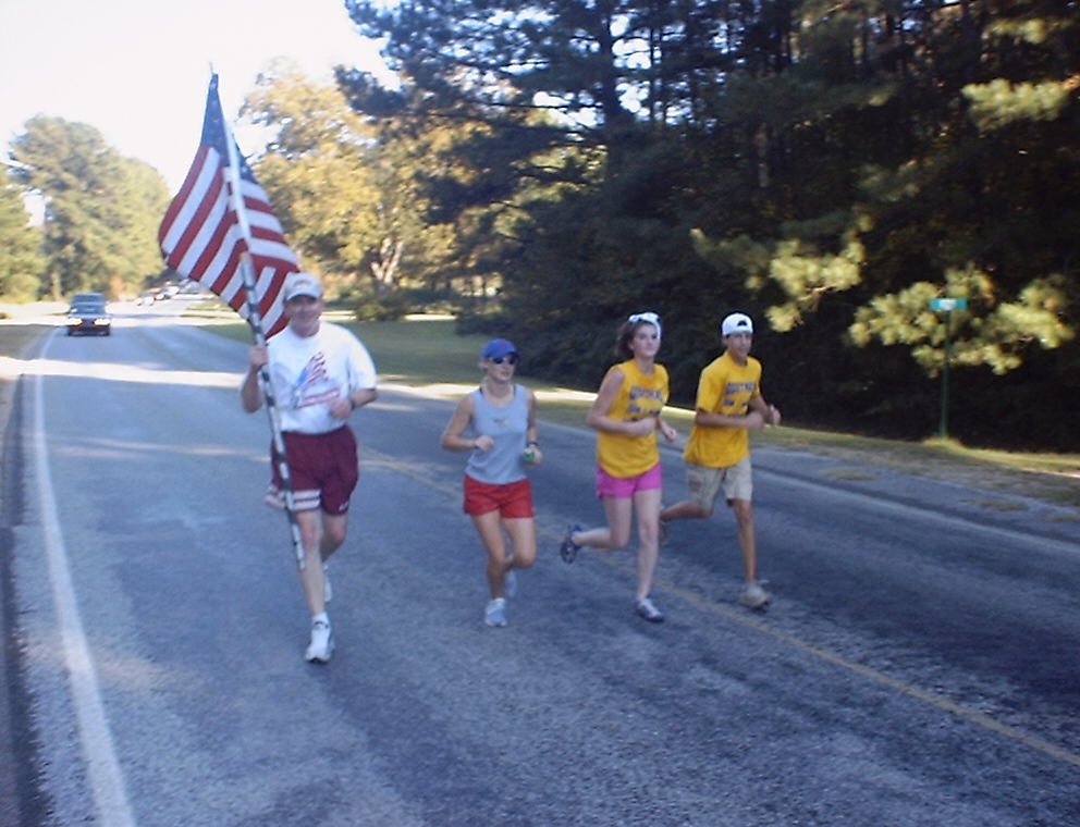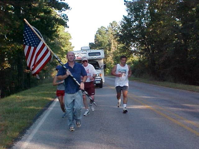 Diary entry from Jerry D. Mason (for publication in the Clarke County Tribune, 11/1/2001). September 11, 2001 will be imbedded in the minds of Americans for years. But October 23, 2001 will be imbedded in the minds of a group of young people and adults who participated in the “Flag Across America” run that crossed Mississippi in a two-day event. Stephanie D. Mason of Shubuta, Kristin Wiederhold, an exchange student from Germany, Dustin Lee of Quitman and Vena Ward of Pachuta took up the call to participate in the run that came through Mississippi on its way to the West Coast. We left Quitman at 3:30 with the intentions of joining the flag run at Chunky, MS. We exited I-20 at the HWY 80 exit at Lost Gap and the enthusiasm of seeing the American Flag, runners and the camper at the truck stop got us to stop and our runners were out and going. Betty Mason and myself in one car and Mrs. Rachel Lee in her pickup followed them for about a mile before I got out to take some pictures and wound up running to stay up with them. The camper following them felt sorry for me and asked me to hop in for some water. The runners ran off-and-on for about 8 miles proudly displaying their pride and their Quitman High School cross-country T-shirts and taking turns carrying the Flag. Almost to Chunky I got my breath back and I was able to carry the flag for a short distance. This all started as a demonstration of American resolve and in support of the victims' families. Employees of American Airlines, United Airlines, and Military Service Members, and Federal employees decided to run with a United States flag across the country. This flag was flown over Iraq in the cockpit of an U.S. F-16 in support of Operation Southern Watch on October 2, 2001. The flag left Boston on October 11, 2001 and will be carried around the clock with a goal to arrive in Los Angeles on Veteran's Day, November 11, 2001. These cities represent the origination and destination of American Flight 11 and United Flight 175. Proceeds from this event will benefit selected charities in support of the victims of the tragedy on September 11, 2001. To make donations to this cause make checks payable to: Americans United Flag Across America c/o Allied First Bank, PO Box 3272, Naperville, IL 60566. Also donations can be made by credit card/debit card by calling 1-800-555-5555 and requesting that a contribution be made to the Flag Run. The progress of the flag can be followed through the web site http://www.flagrun2001.org. |